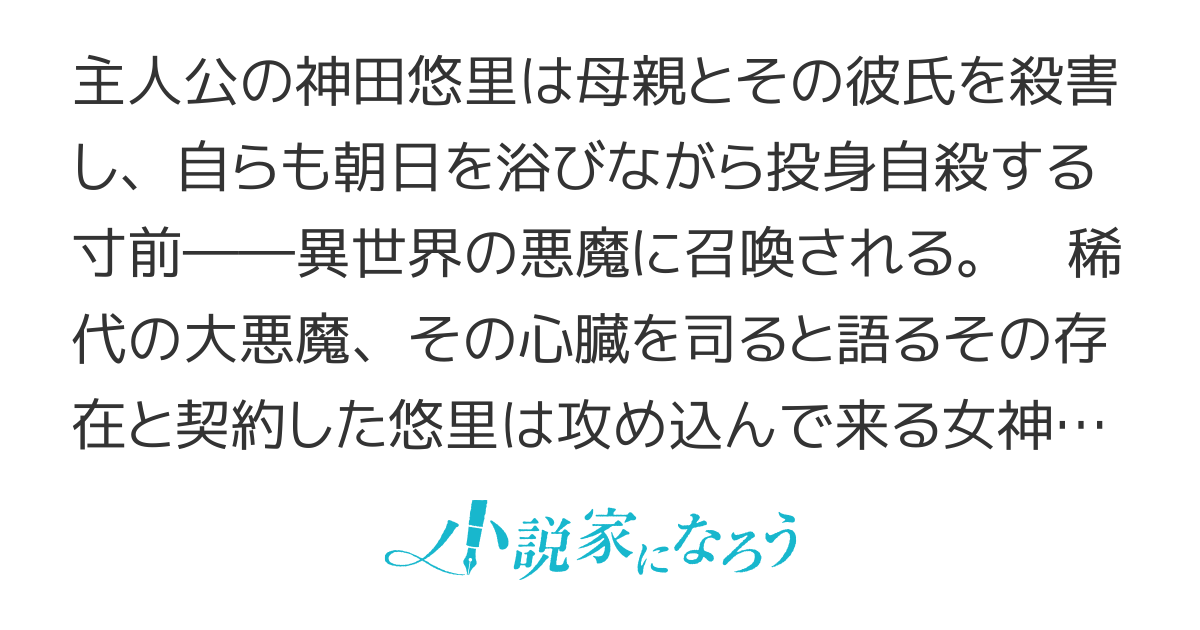 主人公の神田悠里は母親とその彼氏を殺害し、自らも朝日を浴びながら投身自殺する寸前――異世界の悪魔に召喚される。