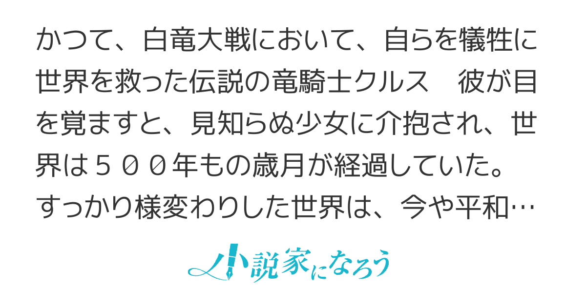 相打ち覚悟で脅威に挑んだ竜騎士が500年後の未來に飛ばされて、竜人少女と一緒にレースする話です。