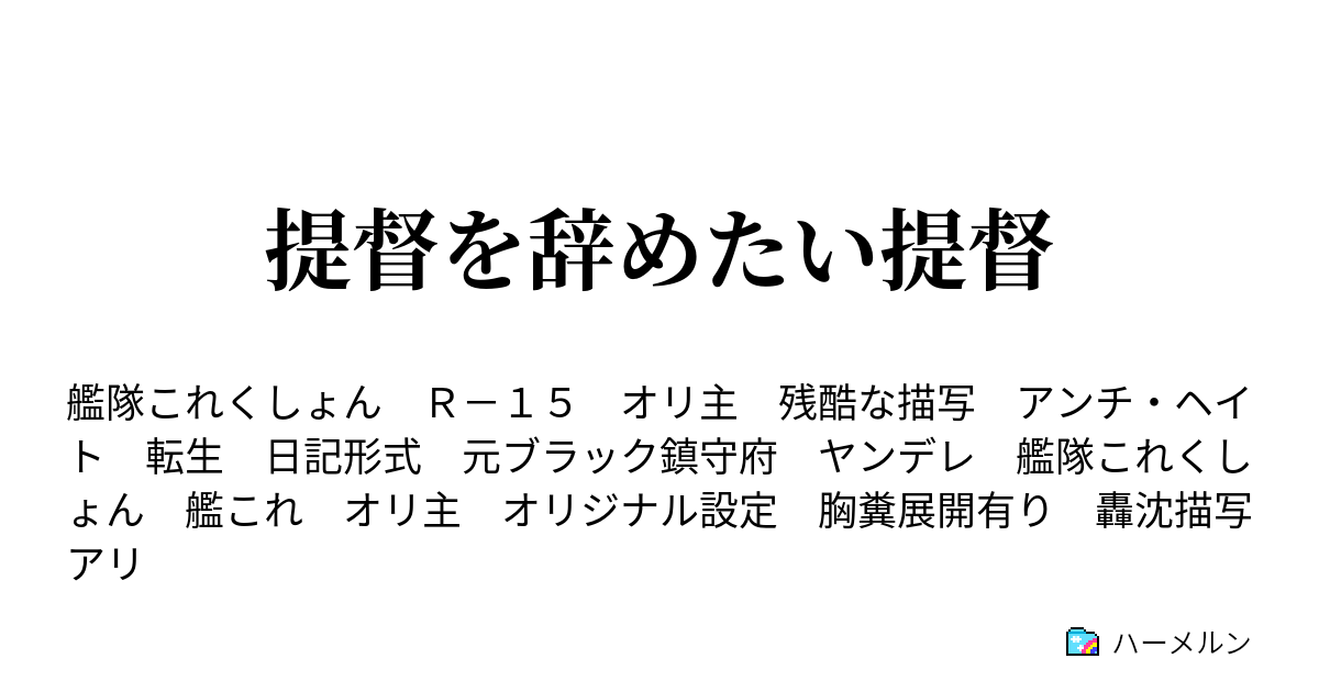 偶然にも提督適性のあった一般人が、提督育成校で訓練を経て元ブラック鎮守府に着任。それからどうにかこうにか提督を辞めようとするお話。  日記形式で進みます(前半…