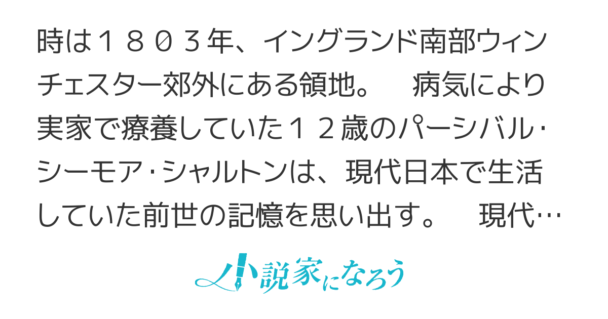 病気により実家で療養していた12歳のパーシバル・シーモア・シャルトンは、現代日本で生活していた前世の記憶を思い出す。